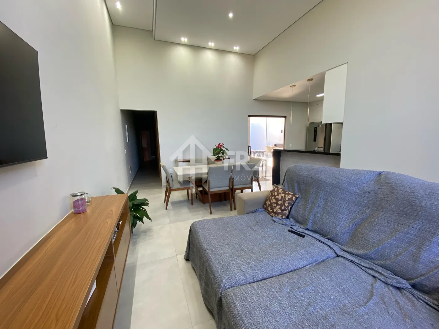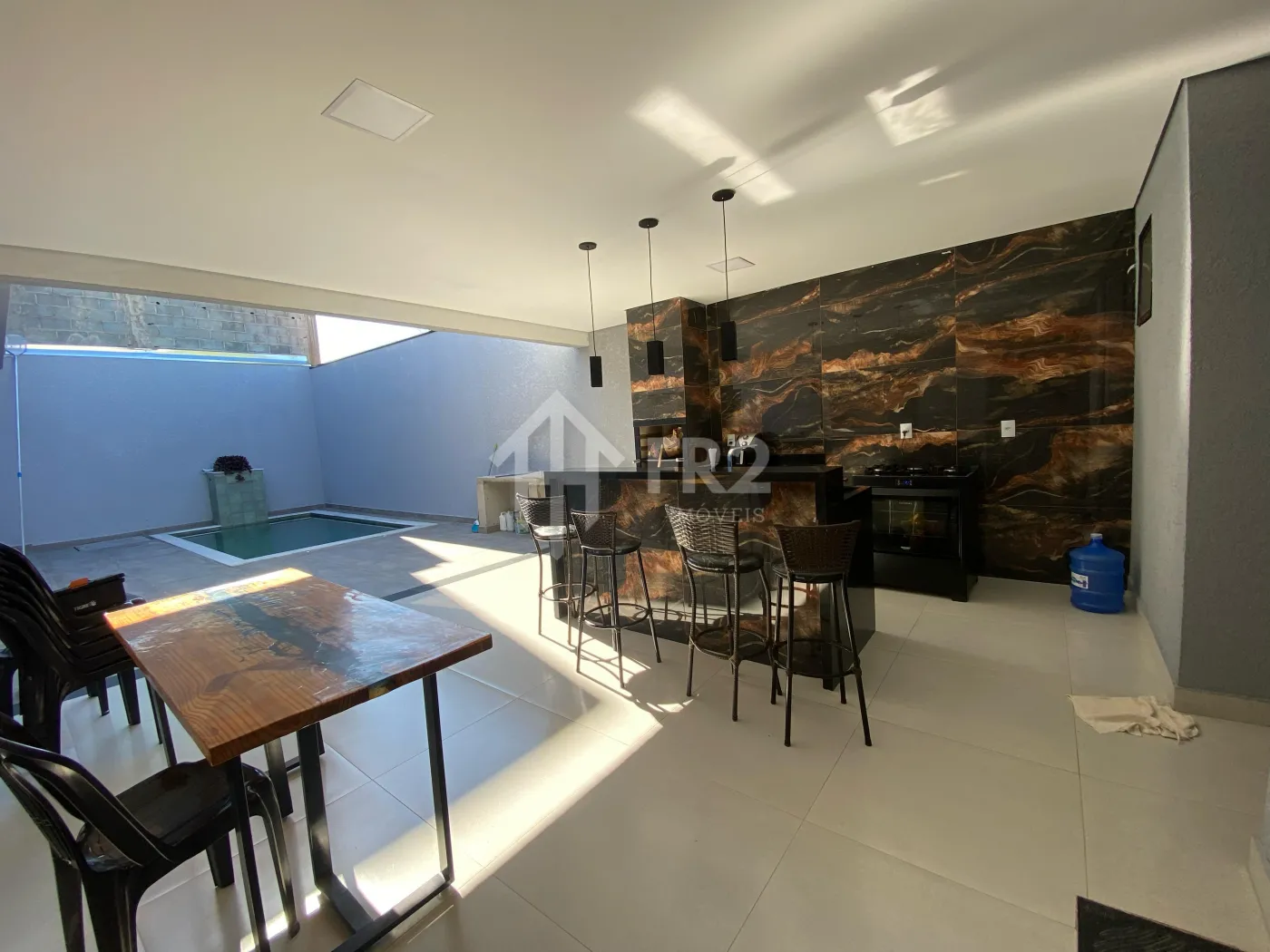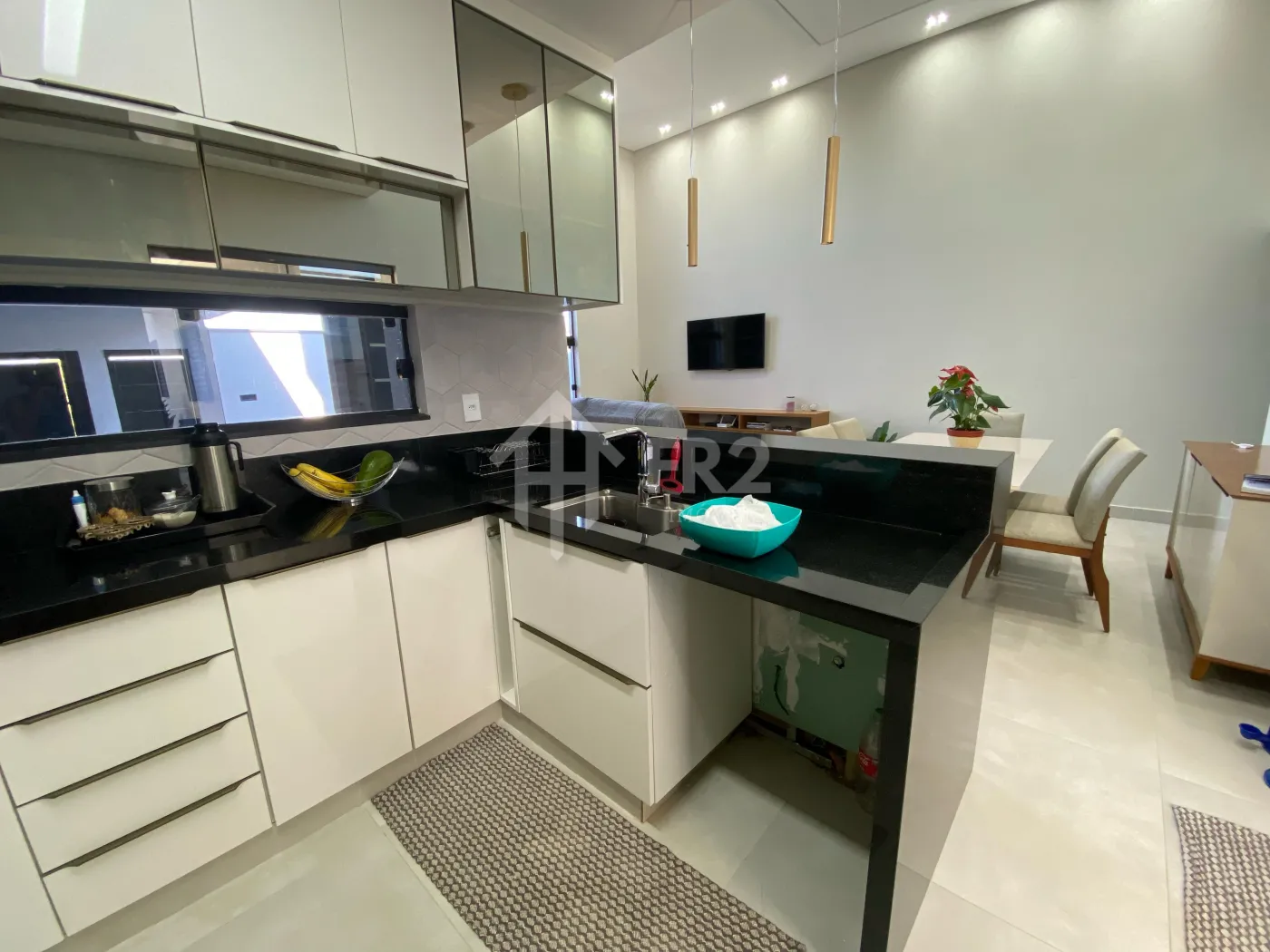 Possui sala ampla com pé-direito alto, proporcionando ótima iluminação natural e sensação de amplitude. A cozinha integrada conta com ilha central e bancada em pedra São Gabriel, além de móveis planejados, unindo sofisticação e funcionalidade.